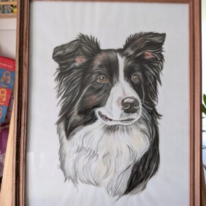 Enmarcada en madera color negro, con paspartú blanco, lista para colgar.